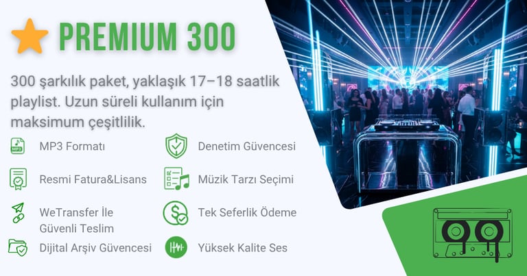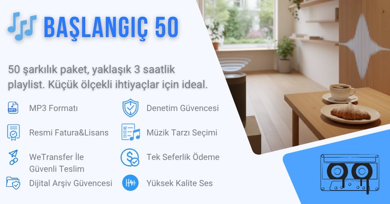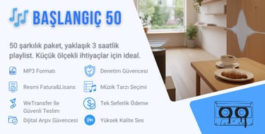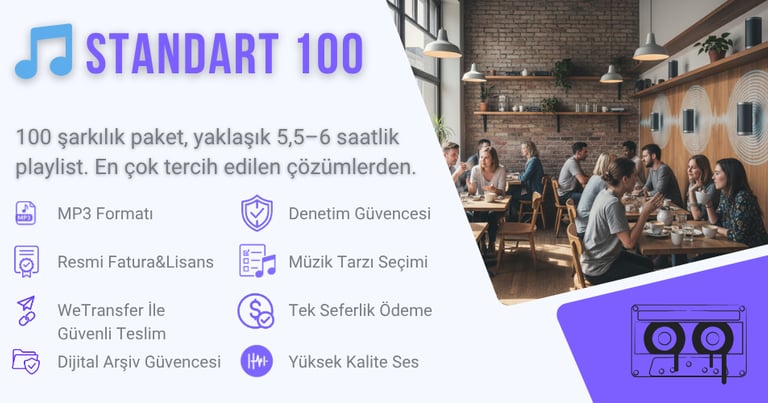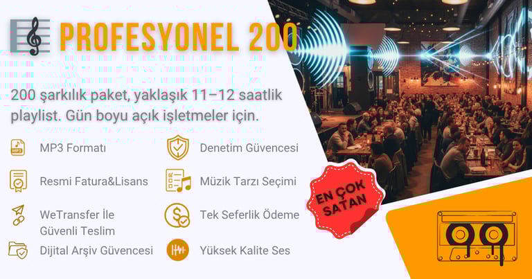Günlük akışı karşılamak isteyen işletmeler için dengeli bir seçenek. Yaklaşık 6 saatlik playlist ile gün boyunca kesintisiz müzik deneyimi sunun. İşletmenizde doğru ritmi yakalamak için uygun paketlerden biri.